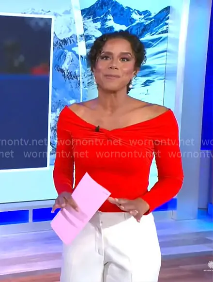 Adriana Diaz on CBS Mornings on CBS was spotted wearing this red off-shoulder top on CBS Mornings on Feb 21 2026's episode. Adriana's Top is the Red Off the Shoulder Knot Jersey Top by Prabal Gurung x RTR.