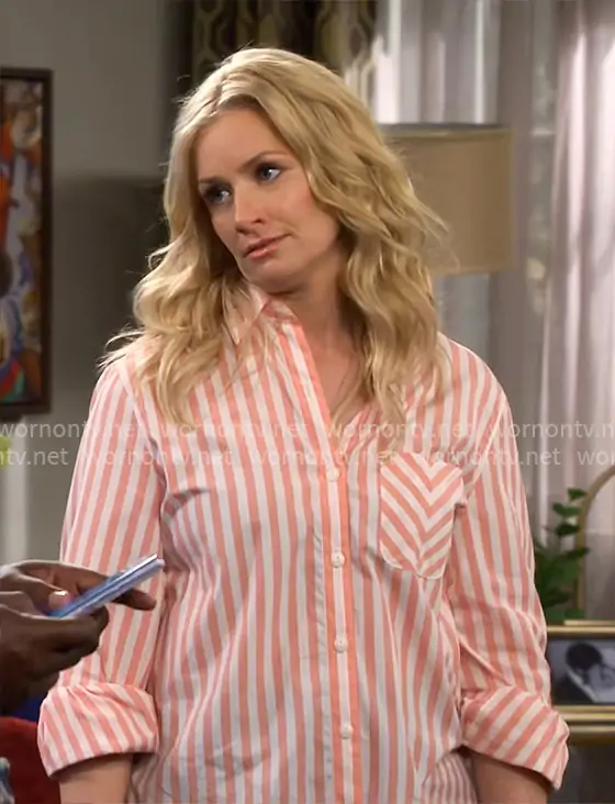 Gemma (played by Beth Behrs) on The Neighborhood on CBS was spotted wearing this coral pink striped shirt on The Neighborhood on episode 'Welcome to the Zhuzh' (8x09) in Feb 2026. Gemma's Top is the Maxine Shirt by Rag and Bone.