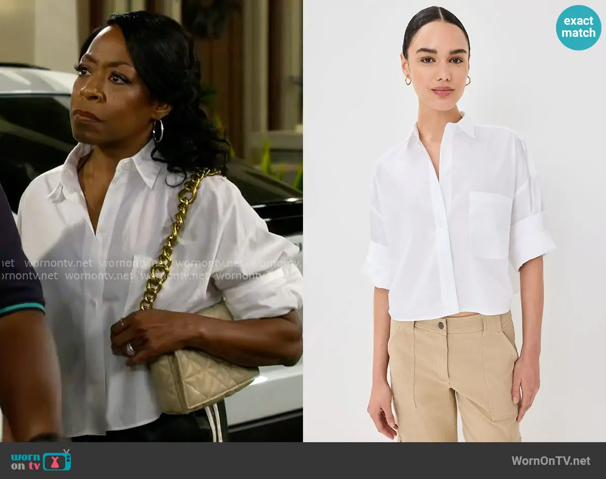 Courtney (played by Skye Townsend) on The Neighborhood on CBS was spotted wearing this floral embroidered shirt on The Neighborhood on episode 'Welcome to the Zhuzh' (8x09) in Feb 2026. Courtney's Top is the Sonny Linen Blend Camp Shirt by Levis.