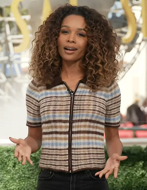 Zuri Hall on Access Hollywood on NBC was spotted wearing this striped short sleeve cardigan on Access Hollywood on Feb 23 2026's episode. Zuri's Sweater is the Leva Short Sleeve Zip Cardigan by Rag and Bone.