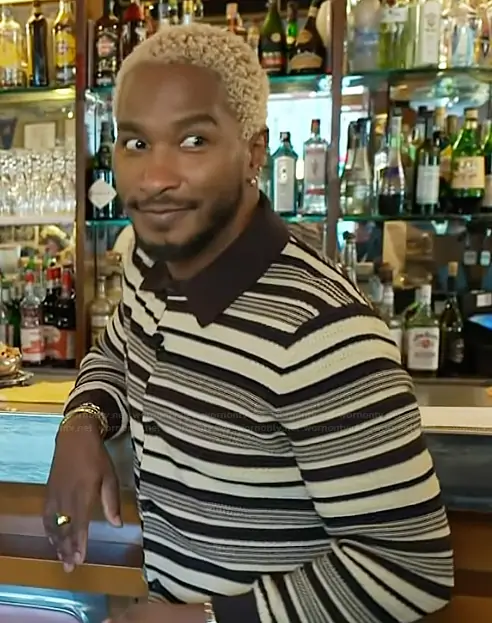 Scott Evans on Access Hollywood on NBC was spotted wearing this brown striped cardigan on Access Hollywood on Feb 23 2026's episode. Scott's Sweater is the Nolan 6686 Stripe Organic Cotton Polo Cardigan by NN07.