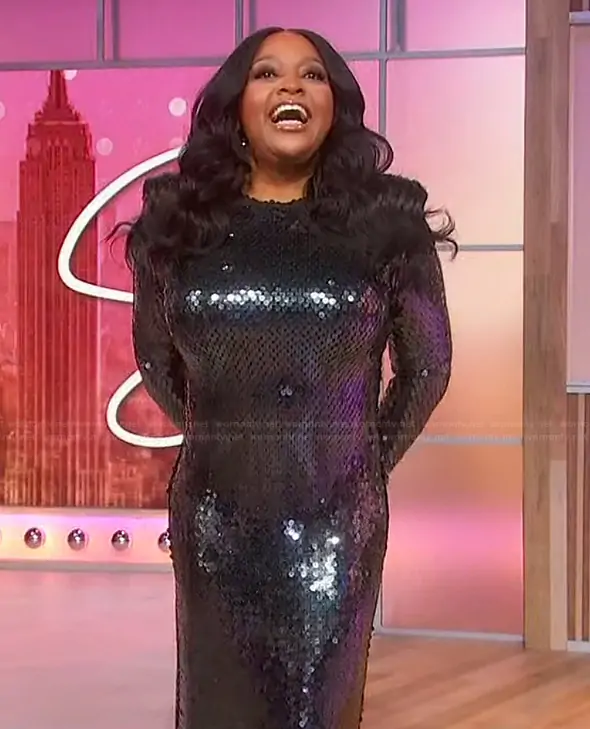 Sherri Shepherd on Sherri on FOX was spotted wearing this black sequin dress on Sherri on Feb 24 2026's episode. Sherri's Dress is the Sequined Long-Sleeve Body-Con Midi-Dress by Sergio Hudson.