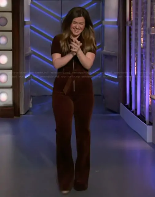 Kelly Clarkson on The Kelly Clarkson Show on NBC was spotted wearing this brown zip front jumpsuit on The Kelly Clarkson Show on Feb 24 2026's episode. Kelly's Jumpsuit is the Gorgeous Wide Leg Jumpsuit by Alice + Olivia.