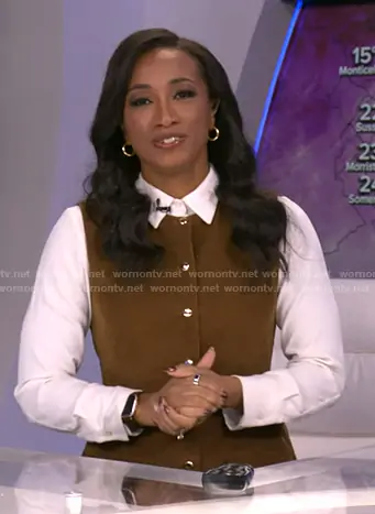 Brittany Bell on Good Morning America on ABC was spotted wearing this brown suede dress on Good Morning America on Feb 25 2026's episode. Brittany's Dress is the Rubelle Corduroy Dress in Camel by Maje.