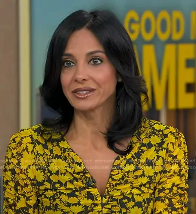 Dr. Tara Narula on Good Morning America on ABC was spotted wearing this yellow floral ruched dress on Good Morning America on Feb 26 2026's episode. Tara's Dress is the Floral Print Mesh Dress by Ganni.