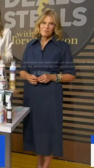Tory Johnson on Good Morning America on ABC was spotted wearing this blue belted slit denim dress on Good Morning America on Feb 26 2026's episode. Tory's Dress is the Belted Stretch Cotton Denim Shirtdress in Denim Blue by Akris.