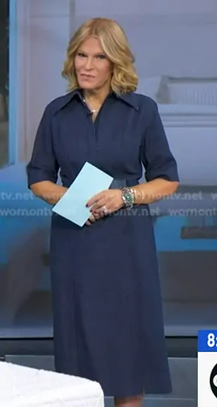 Tory Johnson on Good Morning America on ABC was spotted wearing this blue belted slit denim dress on Good Morning America on Mar 10 2026's episode. Tory's Dress is the Belted Stretch Cotton Denim Shirtdress in Denim Blue by Akris.