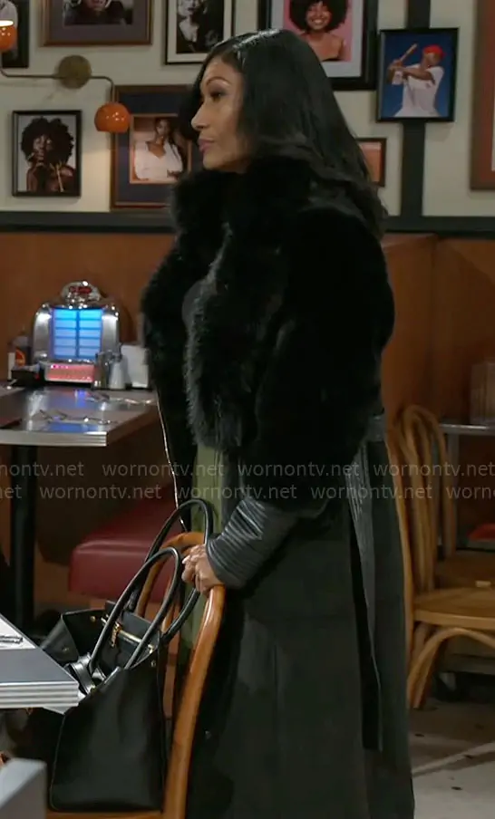 Dana 'Leslie' Thomas (played by Trisha Mann-Grant) on Beyond the Gates on CBS was spotted wearing this black fur and leather ocat on Beyond the Gates on Mar 17 2026's episode. Leslie's Coat is the Goodie Mixed Media Coat by Akira.