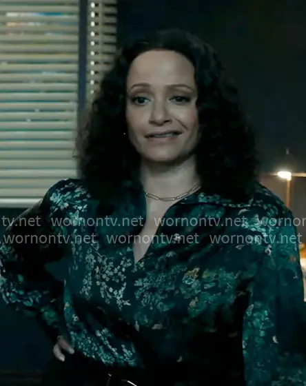 Selena (played by Judy Reyes) on High Potential on Hulu was spotted wearing this black floral shirt on High Potential on episode 'If You Come for the Queen' (2x14) in Mar 2026. Selena's Top is the Grape Vine Blouse by Vince.