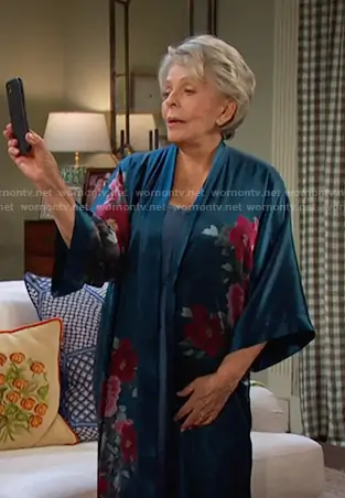 Julie Olson Williams (played by Susan Seaforth Hayes) on Days of our Lives on Peacock was spotted wearing this teal floral silk robe on Days of our Lives on Mar 02 2026's episode. Julie's Robe is the Silk Keina Long Kimono Robe in Teal by Kim + Ono.