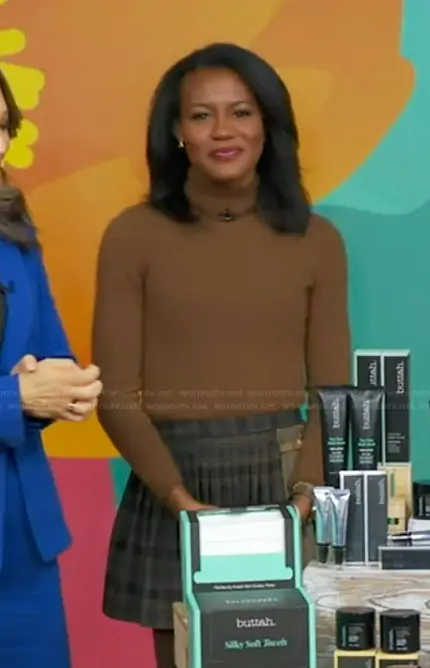 Janai Norman on Good Morning America on ABC was spotted wearing this mixed plaid mini skirt on Good Morning America on Mar 02 2026's episode. Janai's Skirt is the Check pattern pleated mini shirt by Sandro.