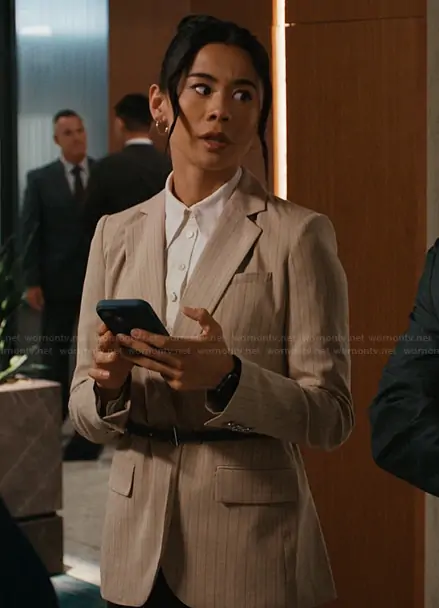 Sarah Franklin (played by Leah Lewis) on Matlock on CBS was spotted wearing this beige pinstripe blazer on Matlock on episode 'Tomorrow Is Still Tomorrow' (2x03) in Oct 2025. Sarah's Blazer is the Belted Pinstripe Jacket by Calvin Klein.