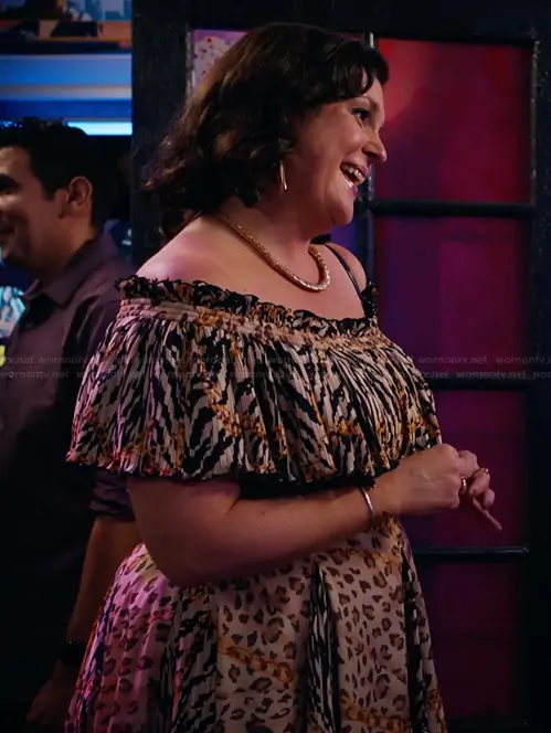 Debra Palmer (played by Melanie Lynskey) on Matlock on CBS was spotted wearing this leopard print off shoulder dress on Matlock on episode 'Piece of My Heart' (2x04) in Nov 2025. 's Dress is the Esmi Dress by Ronny Kobo.