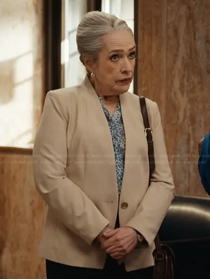 Madeline Matlock (played by Kathy Bates) on Matlock on CBS was spotted wearing this beige blazer on Matlock on episode 'Piece of My Heart' (2x04) in Nov 2025. Madeline's Top is the Chiffon Watercolor Motif Blouse by Brooks Brothers . Madeline's Blazer is the The Cutaway Blazer in Bi-Stretch by Ann Taylor.