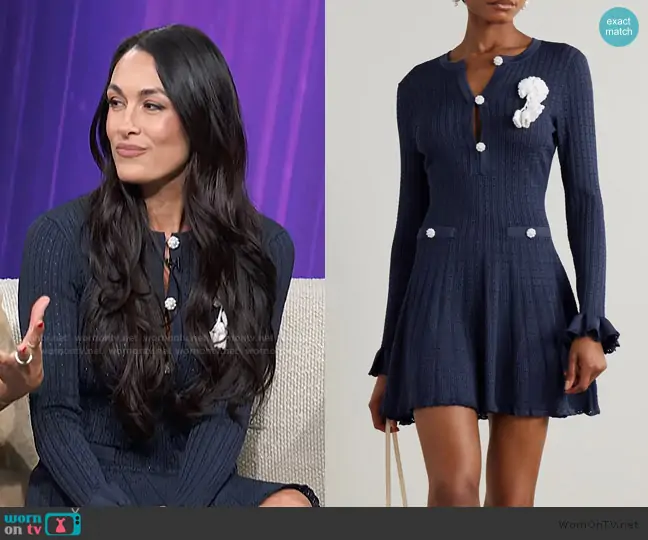 on Access Hollywood on NBC was spotted wearing this navy knit mini dress on Access Hollywood on Mar 04 2026's episode. 's Dress is the Embellished ruffled pointelle-knit mini dress by Self Portrait.