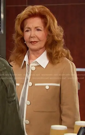 Maggie Horton (played by Suzanne Rogers) on Days of our Lives on Peacock was spotted wearing this beige contrast trim jacket on Days of our Lives on Mar 04 2026's episode. Maggie's Jacket is the Beale Jacket in Khaki by Veronica Beard.