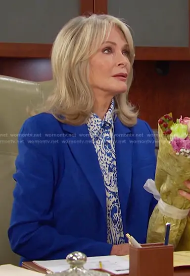 Marlena Evans (played by Deidre Hall) on Days of our Lives on Peacock was spotted wearing this Marlena’s printed shirt and blue long blazer on Days of our Lives on Mar 04 2026's episode. Marlena's Top is the Printed Shirt by Zara . Marlena's Jacket is the One-Button Topper Jacket by DKNY.
