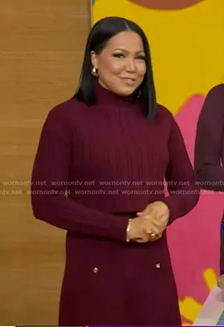 Stephanie Ramos on Good Morning America on ABC was spotted wearing this burgundy sweater and mini skirt on Good Morning America on Mar 04 2026's episode. Stephanie's Dress is the Knit Dress with Removable Sweater in Burgundy by Maje.