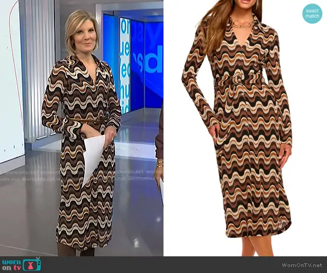 Kate Snow on NBC News Daily on NBC was spotted wearing this red short sleeve shirtdress on NBC News Daily on Mar 04 2026's episode. Kate's Dress is the Short-Sleeve Midi Shirtdress in Red by Vince.