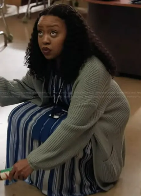 Janine Teagues (played by Quinta Brunson) on Abbott Elementary on ABC was spotted wearing this blue striped dress on Abbott Elementary on episode 'Aide' (5x14) in Mar 2026. Janine's Dress is the Sleeveless Soft Ribbed Knit Belted Maxi Dress by Misook.