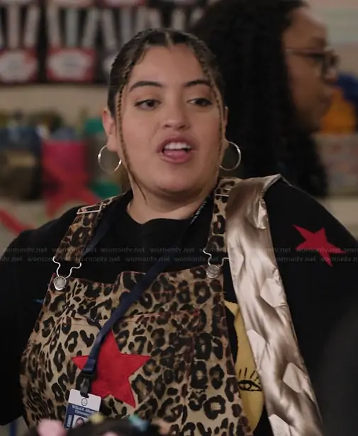 Ashley (played by Keyla Monterroso Mejia) on Abbott Elementary on ABC was spotted wearing this star graphic sweater and overalls on Abbott Elementary on episode 'Aide' (5x14) in Mar 2026. 's Set is the Celestial Knit Long Sleeve Sweater and Pants Set by Dressed in Lala . 's Overalls is the Star Girl Rising Boyfriend Overalls by Dressed in Lala.