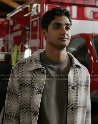 Ravi Panikkar (played by Anirudh Pisharody) on 9-1-1 on ABC was spotted wearing this beige plaid button down shirt on 9-1-1 on episode 'Dads and Cads' (9x12) in Mar 2026. 's Jacket is the Twill Shirt-Jacket in Broken Plaid Grey by Madewell.