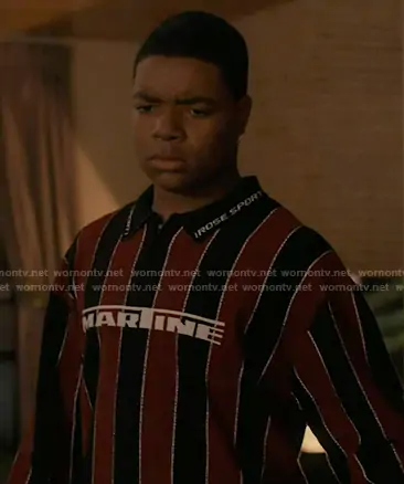 Harry Grant (played by Elijah M. Cooper) on 9-1-1 on ABC was spotted wearing this black and red striped polo shirt on 9-1-1 on episode 'Dads and Cads' (9x12) in Mar 2026. Harry's Shirt is the Striped Polo Shirt by Martine Rose.