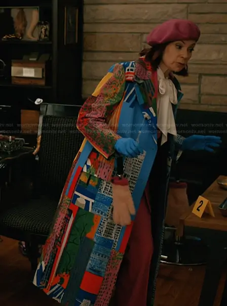 Elsbeth Tascioni (played by Carrie Preston) on Elsbeth on CBS was spotted wearing this cityscape print coat on Elsbeth on episode 'All's Hair' (3x12) in Mar 2026. Elsbeth's Coat is the NYC Cityscape-Print Belted Long Trench Coat by Libertine.