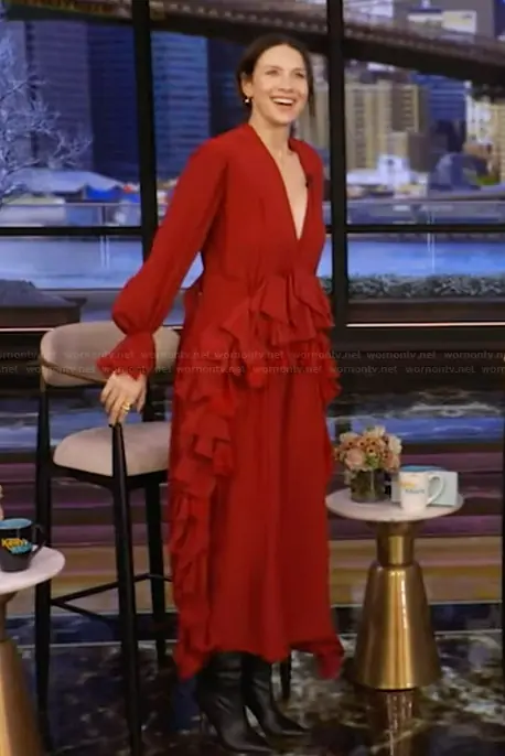 on Live with Kelly and Mark on Disney ABC Home Entertainment was spotted wearing this red ruffle dress on Live with Kelly and Mark on Mar 06 2026's episode. 's Dress is the 2026 Fall Collection by Alberta Ferretti .