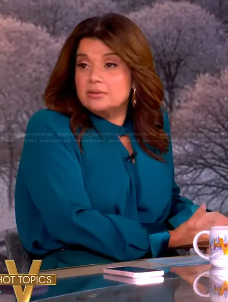 Ana Navarro on The View on ABC was spotted wearing this teal top and pants on The View on Mar 06 2026's episode. Ana's Top is the Silk Button Neck Top by Argent . Ana's Pants is the Soho Trouser by Argent.