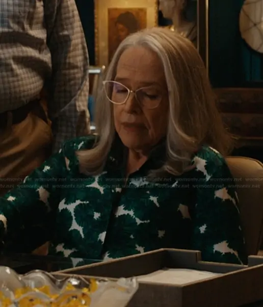 Madeline Matlock (played by Kathy Bates) on Matlock on CBS was spotted wearing this green floral print blouse on Matlock on episode 'Mousetrap' (2x05) in Nov 2025. Madeline's Top is the Rodesia printed silk twill shirt by Max Mara.