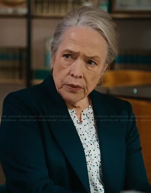 Madeline Matlock (played by Kathy Bates) on Matlock on CBS was spotted wearing this white spotted blouse on Matlock on episode 'Harm Reduction' (2x06) in Nov 2025. Madeline's Top is the Spotted Top by NYDJ.