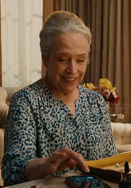 Madeline Matlock (played by Kathy Bates) on Matlock on CBS was spotted wearing this blue floral v-neck top on Matlock on episode 'Prior Bad Acts' (2x07) in Dec 2025. Madeline's Top is the Pintuck Three-Quarter-Sleeved Blouse by NYDJ.
