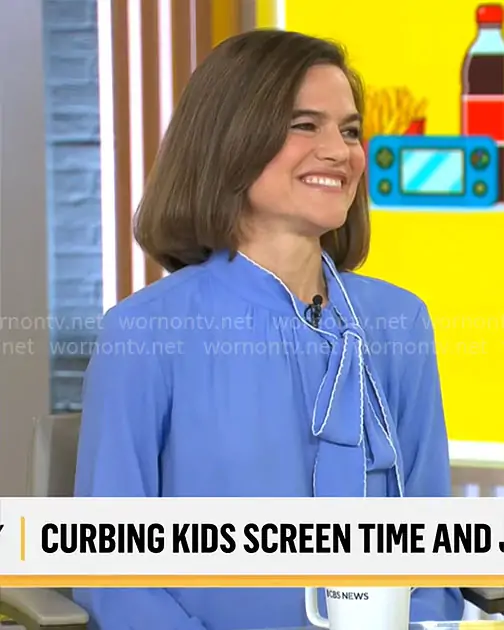 on CBS Mornings on CBS was spotted wearing this blue tie-neck blouse on CBS Mornings on Mar 08 2026's episode. 's Top is the Contrast Tie Neck Long-Sleeve Top by Bcbg .