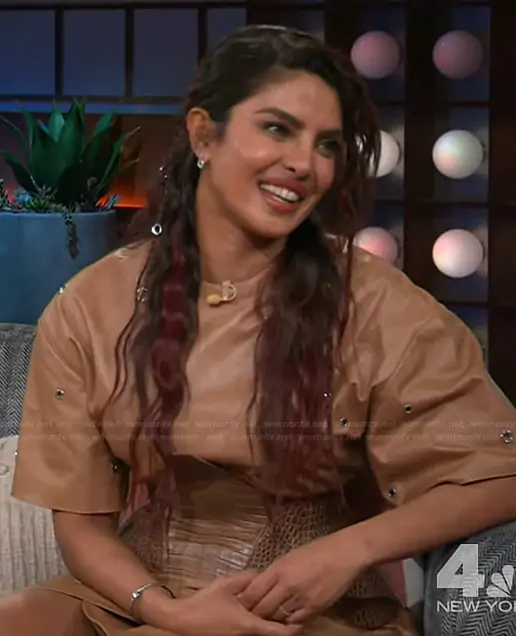 on The Kelly Clarkson Show on NBC was spotted wearing this brown leather grommet dress on The Kelly Clarkson Show on Mar 09 2026's episode. 's Dress is the Embroidered leather dress in mocha by Epuzer.