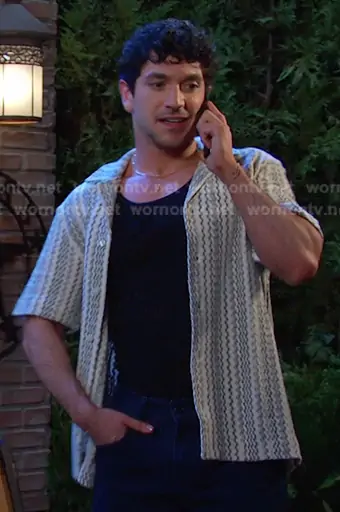Javi Hernandez (played by Al Calderon) on Days of our Lives on Peacock was spotted wearing this zig zag stripe shirt on Days of our Lives on Mar 09 2026's episode. 's Shirt is the Relaxed-Fit Wavy Stripe Cotton Resort Shirt by Natural Beige by Banana Republic . 's Shoes is the Chuck Taylor All Star High Street Sneakers by Converse.