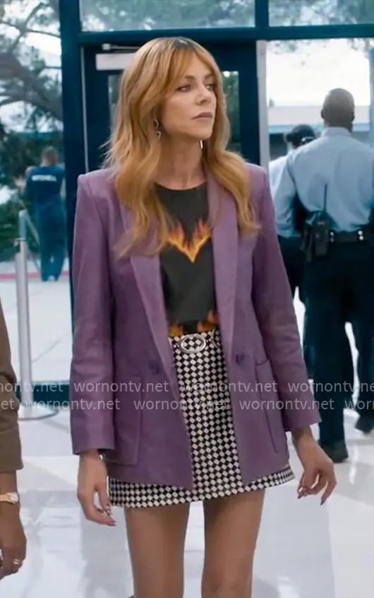 Morgan Gillory (played by Kaitlin Olson) on High Potential on Hulu was spotted wearing this flame heart t-shirt and purple leather jacket on High Potential on episode 'If You Come for the Queen' (2x14) in Mar 2026. Morgan's Top is the Croft Fire Heart Tee by Lauren Moshi . Morgan's Skirt is the Elana Faux Leather Miniskirt in Black Biscotti by Alice + Olivia . Morgan's Jacket is the Visko Crinkle Leather Blazer in Goa by Zadig & Voltaire . Morgan's Shoes is the Pelagiana Boots by Azalea Wang . Morgan's Bag is the Wild West x Wild Thing Bucket Bag by Of The Sun Leather.