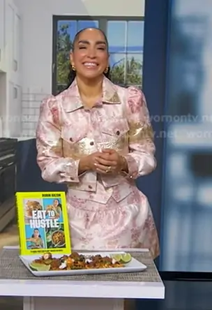 on Good Morning America on ABC was spotted wearing this pink jacquard jacket and mini skirt on Good Morning America on Mar 10 2026's episode. 's Top is the Kelcey Floral Jacquard Strapless Top in English Rose Toile by Alice + Olivia . 's Jacket is the Lana Puff Sleeve Jacket in English Rose Toile by Alice + Olivia . 's Skirt is the Ella Toile Jacquard Miniskirt in English Rose Toile by Alice + Olivia . 's Shoes is the The Kiki Ankle Boots by Marc Jacobs.