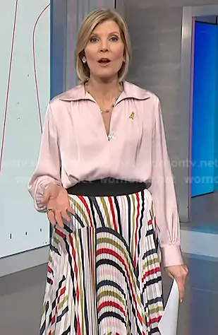 Kate Snow on NBC News Daily on NBC was spotted wearing this pink collared blouse and striped pleated skirt on NBC News Daily on Mar 10 2026's episode. Kate's Top is the Silk-blend Blouse by Vince . Kate's Skirt is the Multicolor Pleated Twill Skirt by Milly.