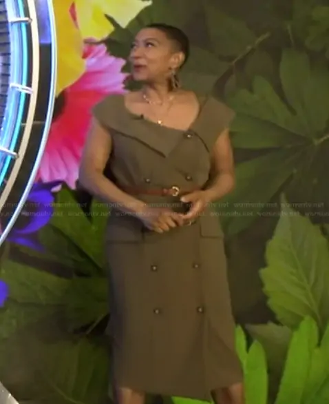 Deja Vu on Live with Kelly and Mark on Disney ABC Home Entertainment was spotted wearing this olive double breasted dress on Live with Kelly and Mark on Mar 11 2026's episode. Deja Vu's Dress is the Asymmetric-Neck Double-Breasted Dress by Donna Karan.