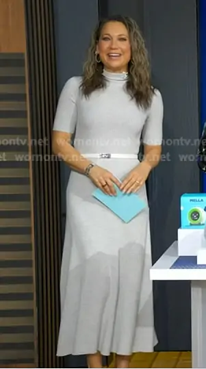 Ginger Zee on Good Morning America on ABC was spotted wearing this grey ribbed mock neck dress on Good Morning America on Mar 11 2026's episode. Ginger's Dress is the Farie Rib Wool Maxi Sweater Dress by Boss.