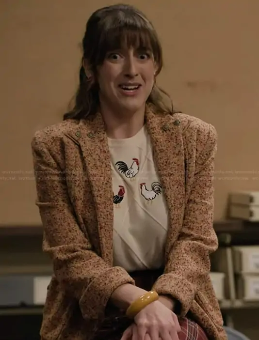 Tina Schwartz (played by Kate Peterman) on Abbott Elementary on ABC was spotted wearing this rooster embroidered top on Abbott Elementary on episode 'Safety Day' (5x15) in Mar 2026. 's Top is the Cream Embroidered Chicken Short Sleeve Sweater by Target.