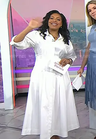 Sheinelle Jones on Today on NBC was spotted wearing this white poplin midi dress on Today on Mar 12 2026's episode. Sheinelle's Dress is the Jazz Core Cotton Poplin Pintuck Midi-Dress by Simkhai.