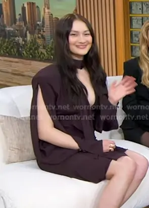 on Good Morning America on ABC was spotted wearing this burgundy draped mini dress on Good Morning America on Mar 12 2026's episode. 's Dress is the Long Sleeve Mini Dress in Dark Plum by Mugler . 's Shoes is the Stessysling Pumps in Dark Brown by Aldo.