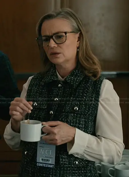 (played by ) on Elsbeth on CBS was spotted wearing this Black tweed sleeveless dress on Elsbeth on episode 'Murder Six Across' (3x13) in Mar 2026. 's Dress is the Patch Pocket Button Down Dress by Ted Baker.
