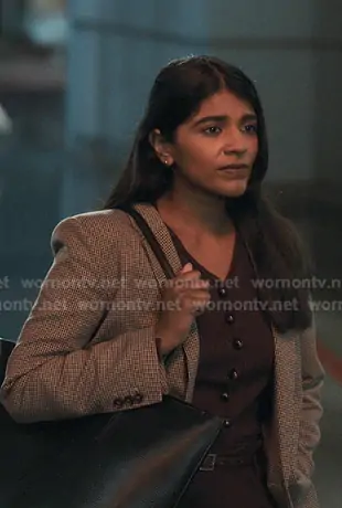 Kavita Mohanty (played by Anita Kalathara) on Greys Anatomy on ABC was spotted wearing this brown ribbed cardigan and grey houndstooth blazer on Greys Anatomy on episode 'Love the Way You Lie' (22x13) in Mar 2026. 's Sweater is the Rib-knit Cardigan in Dark Brown by H&M . 's Jacket is the Houndstooth Double Breasted Blazer in Burgundy by Mango.