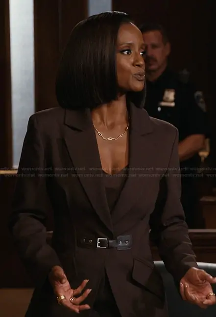 Olympia (played by Skye P. Marshall) on Matlock on CBS was spotted wearing this brown belted blazer on Matlock on episode 'Tail Lights' (2x11) in Mar 2026. Olympia's Blazer is the Belted Tailored Blazer by Nocturne.