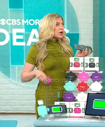 Ashley Bellman on CBS Mornings on CBS was spotted wearing this green ruched front midi dress on CBS Mornings on Mar 12 2026's episode. Ashley's Dress is the Gracelyn Dress in Cardamom by Toccin .