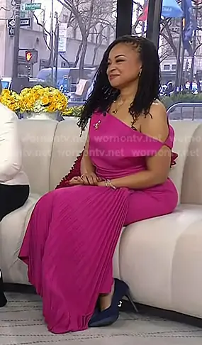 on Today on NBC was spotted wearing this fuchsia one shoulder pleated dress on Today on Mar 13 2026's episode. 's Dress is the Paulina Oblique Shoulder Midi Dress by Bella Barnet.