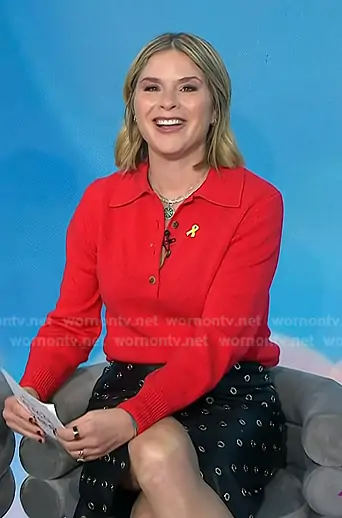 Jenna Bush Hager on Today on NBC was spotted wearing this red polo sweater and grommet skirt on Today on Mar 13 2026's episode. Jenna's Sweater is the The Cashmere Polo in Cherry by Sold Out NYC . Jenna's Skirt is the Anderson Leather Grommet Skirt by Veronica Beard.